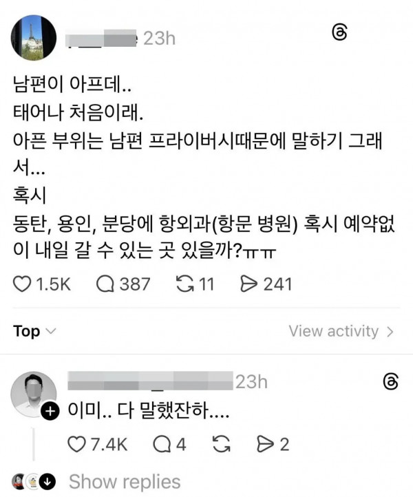 남편이 아프대.. 태어나 처음이래 페이지 정보 작성자 pkg 댓글 0건 조회 149회 작성일 26-04-26 01:02 목록 답변 글쓰기 본문 이전글아무리 급해도 알바로 20대 쓰지마세요 26.04.26 다음글유적지 복원 전 & 후 사진 26.04.26 댓글 0 댓글목록 등록된 댓글이 없습니다.
