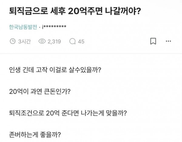 퇴직금으로 세후 20억 주면 나갈 거야? 페이지 정보 작성자 pkg 댓글 0건 조회 161회 작성일 26-04-28 06:45 목록 답변 글쓰기 본문 이전글트위터에 예쁜 찻잔 사진을 자랑하던 사람의 최후 26.04.28 다음글학교에 민원 넣으면 그 후에 일어나는 일 26.04.28 댓글 0 댓글목록 등록된 댓글이 없습니다.