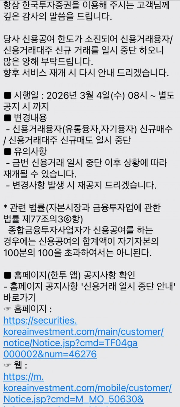 한국투자증권 : 이제 돈 못 빌려드려요 페이지 정보 작성자 pkg 댓글 0건 조회 116회 작성일 26-03-05 03:53 목록 답변 글쓰기 본문 어제 날라온 문자임 “신용공여 한도 소진” 한국투자증권에서 빌려줄 수 있는 돈 다 빌려줘서 더 이상 못 빌려준다는 말임 이말인 즉슨, 어제 하락장에 사람들이 ㅈ나게 신용써가며 빚투로 물 ㅈ나 탔다는 말인데… 그저 ㅈ되었다 한국투자증권 : 이제 돈 못 빌려드려요 이전글이삿짐 나르고 35만 원 번 대학생 26.03.05 다음글의외로 갓길운전해도 되는 사유 26.03.04 댓글 0 댓글목록 등록된 댓글이 없습니다.
