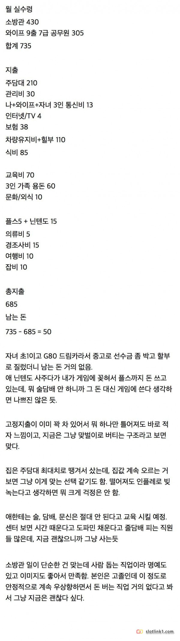 실수령 730만원 3인 가족 생활비 페이지 정보 작성자 pkg 댓글 0건 조회 206회 작성일 26-03-29 22:40 목록 답변 글쓰기 본문 연봉으로 치면 세전 1억 2천인데도 별로 남는게 없네요. 이전글울먹울먹 자식에게 외면당한 아버지 26.03.29 다음글고려청자에서 조선백자로 넘어가는 과정 26.03.29 댓글 0 댓글목록 등록된 댓글이 없습니다.