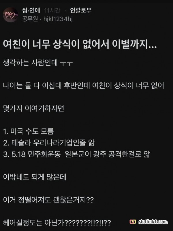여친이 상식이 너무 부족해서 이별을 고민중인 공무원 페이지 정보 작성자 pkg 댓글 0건 조회 212회 작성일 26-04-30 09:35 목록 답변 글쓰기 본문 이전글이런걸 진짜 20만원씩 주고 사는 사람이 있나 ㄷㄷ 26.04.30 다음글전세계 반도체 대표 기업 요약 26.04.30 댓글 0 댓글목록 등록된 댓글이 없습니다.