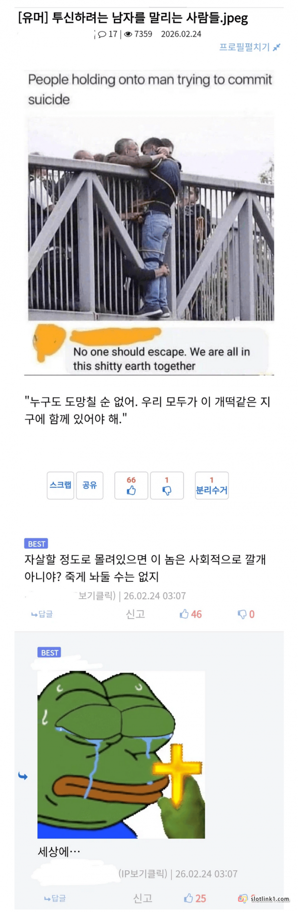 현실 로그아웃을 사회가 막는 이유 페이지 정보 작성자 pkg 댓글 0건 조회 194회 작성일 26-02-25 19:27 목록 답변 글쓰기 본문 이전글요즘에 당근에 보이는 불법행위들 26.02.25 다음글3년을 기다린 아기의 복수 26.02.25 댓글 0 댓글목록 등록된 댓글이 없습니다.