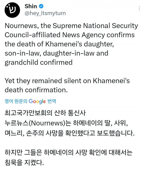 하메네이 친딸, 손주, 며느리, 사위 사망확인 페이지 정보 작성자 pkg 댓글 0건 조회 160회 작성일 26-03-02 03:10 목록 답변 글쓰기 본문 하메네이 친딸, 손주, 며느리, 사위 사망확인 이전글'삼일절' 중학교 교사 마라톤 논란 26.03.02 다음글탑게이 홍석천 성님 생일파티 근황 26.03.02 댓글 0 댓글목록 등록된 댓글이 없습니다.