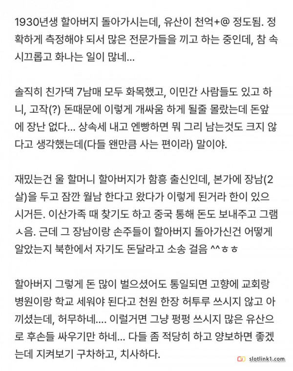 천억 유산에 온 집안 박살나는 구나… 페이지 정보 작성자 pkg 댓글 0건 조회 154회 작성일 26-03-16 23:10 목록 답변 글쓰기 본문 북한 얘기가 주작같지만 실제로 있는 사례라고 함 +아래 뉴스는 예시, 위 사례라는 뜻이 아님 이전글판교 환풍구 추락 사고 26.03.16 다음글펜싱검에 새겨진 멋있는 문구 26.03.16 댓글 0 댓글목록 등록된 댓글이 없습니다.