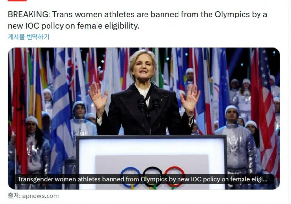 트렌스젠더 여성들, 올림픽 출전 금지 페이지 정보 작성자 pkg 댓글 0건 조회 160회 작성일 26-03-27 20:43 목록 답변 글쓰기 본문 그동안 트젠들이 올림픽 나가서 일반 여자 선수들이랑 대결해서 논란이 있었는데 결국 출전 금지됨 ㅋㅋㅋㅋ 트렌스젠더 여성들, 올림픽 출전 금지 이전글건더기 있는 캔음료 쉽게 마시는 법 26.03.27 다음글대한민국 사람들은 참 착해 26.03.27 댓글 0 댓글목록 등록된 댓글이 없습니다.