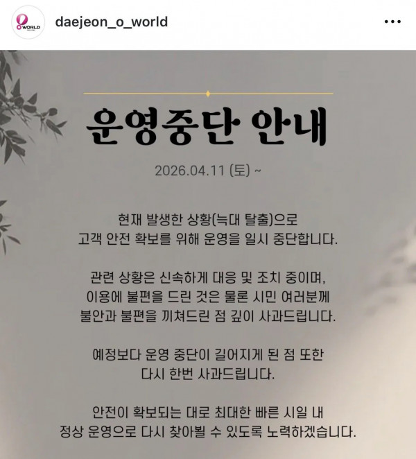 늑대 탈출했던 대전 오월드 근황 페이지 정보 작성자 pkg 댓글 0건 조회 172회 작성일 26-04-12 03:51 목록 답변 글쓰기 본문 오늘부터 늑구 잡을때까지 운영 중단한다함 늑대 탈출했던 대전 오월드 근황 이전글바람을 안 피우는 남자들의 특징 26.04.12 다음글정말 살인날 것 같은 엘리베이터 메모 26.04.12 댓글 0 댓글목록 등록된 댓글이 없습니다.
