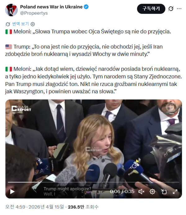 이태리 총리, "핵무기 가졌으면 위상에 맞는 자세를 보여라" 페이지 정보 작성자 pkg 댓글 0건 조회 159회 작성일 26-04-17 02:18 목록 답변 글쓰기 본문 ㄷㄷㄷ 이전글일본 수학여행 155만원 ㄷㄷ 26.04.17 다음글헤헤 당분간 내 아침인데 할인 받음 26.04.17 댓글 0 댓글목록 등록된 댓글이 없습니다.