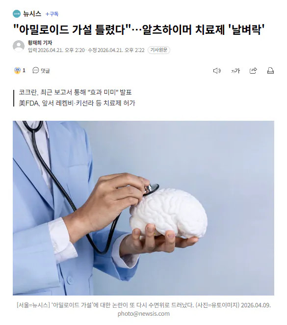 "아밀로이드 가설 틀렸다"…알츠하이머 치료제 '날벼락' 페이지 정보 작성자 pkg 댓글 0건 조회 239회 작성일 26-04-22 11:34 목록 답변 글쓰기 본문 https://n.news.naver.com/mnews/article/003/0013900506 알츠하이머 치료제가 효과가 없다는 연구 결과가 나오면서 ‘아밀로이드 가설’에 대한 논란이 또 다시 수면위로 드러났다. 이전글싱글벙글 타이어 공짜로 바꾸는방법 26.04.22 다음글오싹오싹 한국 & 일본 일자리 수 26.04.22 댓글 0 댓글목록 등록된 댓글이 없습니다.