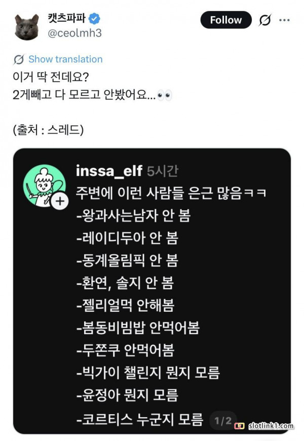 유행에 관심 없는 사람.jpg 페이지 정보 작성자 fiveou 댓글 0건 조회 602회 작성일 26-03-16 23:14 목록 답변 글쓰기 본문 유행에 관심 없는 사람 이전글 북한이 이와중에 갑자기 미사일 발사를 한 이유 26.03.17 다음글 4월부터 해외여행 유류할증료 최대 251.900원.jpg 26.03.16 댓글 0 댓글목록 등록된 댓글이 없습니다.
