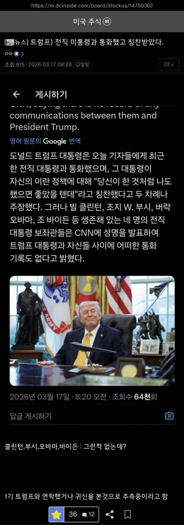 트럼프 : 전직 미 대통령과 통화했고 칭찬받았다