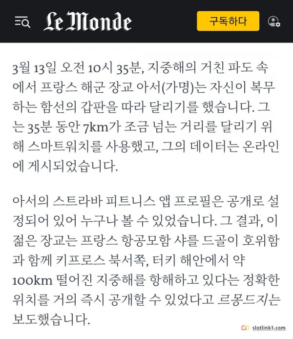 프랑스 항공모함 작전 위치가 노출된 이유 페이지 정보 작성자 fiveou 댓글 0건 조회 313회 작성일 26-03-24 17:31 목록 답변 글쓰기 본문 선원이 스마트워치 끼고 조깅해서(...)그 GPS 내역이 스트라바(운동앱)에 그대로 올라가서 공개됨 이전글 이중 가장 좋아하는 면요리는?.jpg 26.03.24 다음글 트럼프 : 전쟁부 장관이 먼저 전쟁하자고 했다 26.03.24 댓글 0 댓글목록 등록된 댓글이 없습니다.