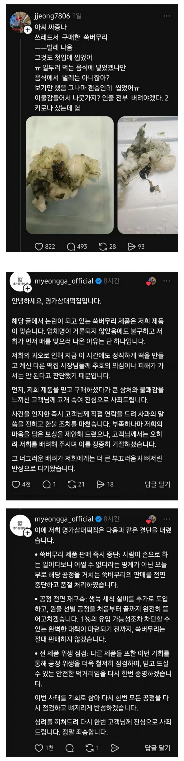 이물질 나온 떡집의 대응수준 페이지 정보 작성자 fiveou 댓글 0건 조회 213회 작성일 26-04-01 14:16 목록 답변 글쓰기 본문 빠른 결단력재대로 된 대응완벽한 사과문과 재발방지책딴 논란된 브랜드들이 이렇게만 했더라면… 이전글 붉사 그래픽 칭찬하다 시비 털린 유저 26.04.01 다음글 트럼프 : 호르무즈 해협은 우리 일 아냐 26.04.01 댓글 0 댓글목록 등록된 댓글이 없습니다.