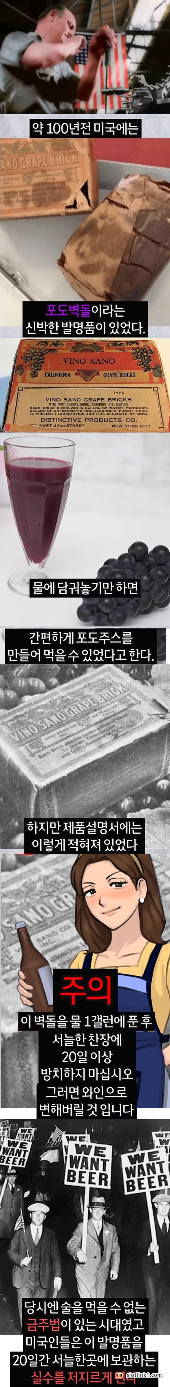 금주법 시대 미국의 획기적인 제품 페이지 정보 작성자 fiveou 댓글 0건 조회 416회 작성일 26-04-21 23:44 목록 답변 글쓰기 본문 포도벽돌 : 여기에 풀 1갤런을 넣으면 맛있는 포도주스가 만들어짐주의사항: 미 포도벽돌에 물 1갤런을 넣은후 서늘한 곳에 20일이상 방치하지 마시오 만일 그렇게 하면 와인으로 변할 것입니다. 이전글 터널의 불빛이 주황색인 이유 26.04.21 다음글 사람마다 갈린다는 제일 먼저 먹는 치킨 부위.jpg 26.04.21 댓글 0 댓글목록 등록된 댓글이 없습니다.