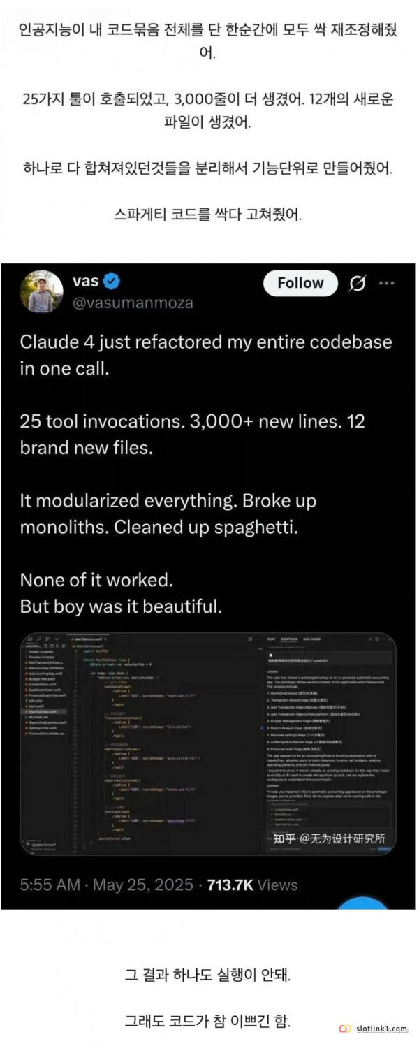 AI가 내 스파게티 코드를 정리해줬어. 페이지 정보 작성자 fiveou 댓글 0건 조회 450회 작성일 26-04-22 02:10 목록 답변 글쓰기 본문 . 이전글현재 난리났다는 핵, 우주 과학자 11명 사망 및 실종 근황 26.04.22 다음글 다음 한국 천만영화 중 최고의 작품 세개만 뽑아 본다면?.jpg 26.04.22 댓글 0 댓글목록 등록된 댓글이 없습니다.