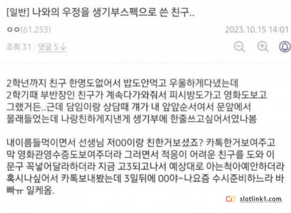 나와의 우정을 생기부 스펙으로 쓴 친구 페이지 정보 작성자 pkg 댓글 0건 조회 145회 작성일 26-04-23 17:22 목록 답변 글쓰기 본문 아.. 이전글회사 탕비실에서 벌어진 암살시도 26.04.23 다음글징역 살면서 뚜드려 맞기 힘든 이유 26.04.23 댓글 0 댓글목록 등록된 댓글이 없습니다.