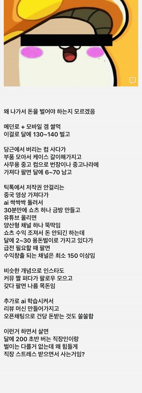 나가서 돈버는게 이해 안되는 디시인 페이지 정보 작성자 pkg 댓글 0건 조회 143회 작성일 26-04-27 11:52 목록 답변 글쓰기 본문 업무 루틴이 어지간한 직장인보다 더 성실함 ㅋㅋㅋㅋ 넌 그냥 나가지 말고 돈 벌어라 이전글이스라엘에서 안쓰는 수학기호 26.04.27 다음글정신과 의사 10명 중 9명이 강추하는 스트레스 해소법 26.04.27 댓글 0 댓글목록 등록된 댓글이 없습니다.