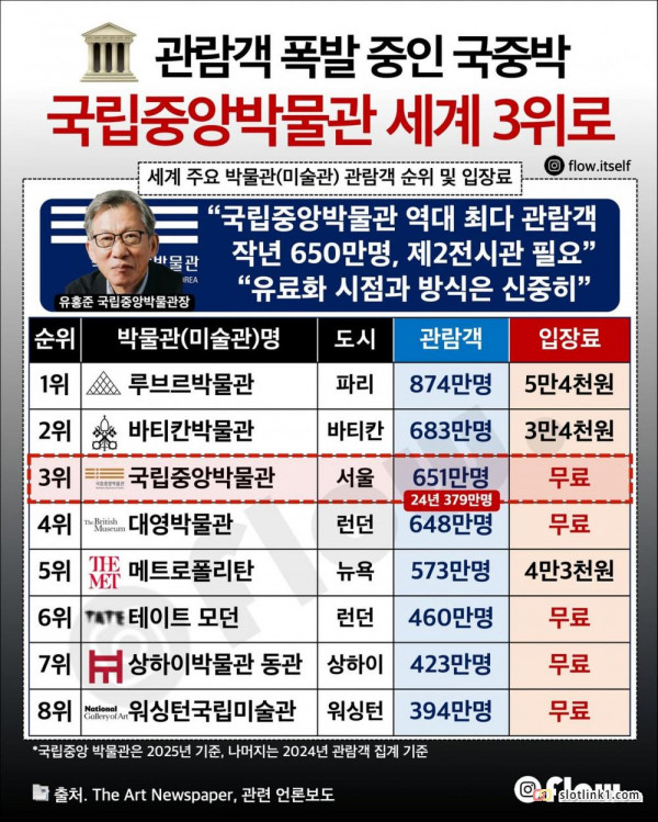 관람객 순위 세계 3위 찍은 국립중앙박물관 페이지 정보 작성자 pkg 댓글 0건 조회 162회 작성일 26-03-10 03:05 목록 답변 글쓰기 본문 이전글논란중인 샤워할 때 위치 26.03.10 다음글2만원으로는 깜빵 안간다는 사기꾼의 최후 26.03.10 댓글 0 댓글목록 등록된 댓글이 없습니다.