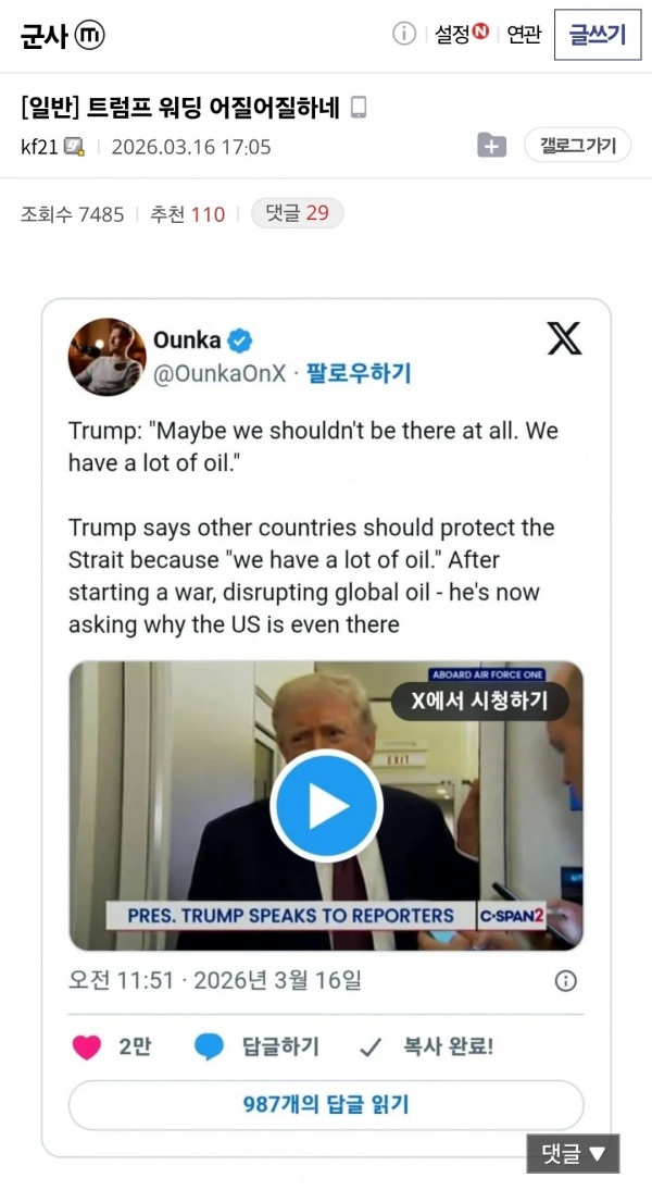 멘탈 완전히 박살난 트럼프 페이지 정보 작성자 pkg 댓글 0건 조회 221회 작성일 26-03-18 04:29 목록 답변 글쓰기 본문 이전글논문으로 밝혀진 댕댕이 상식 26.03.18 다음글당근에 올라온 24만원 가스버너 26.03.18 댓글 0 댓글목록 등록된 댓글이 없습니다.