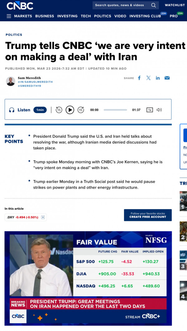 현지시간 23일 오전, 트럼프 대통령은 CNBC와의 통화에서 "이란과 합의를 이뤄낼 의지가 매우 강하다(very intent on making a deal)"고 강조했습니다. 앞서 그는 트루스소셜을 통해 이란과의 "매우 좋고 생산적인 대화"가 있었다고 주장하며, 호르무즈 해협 재개방을 조건으로 내걸었던 '48시간 최후통첩' 시한을 앞두고 전격적인 공습 유예 결정을 내렸습니다.
