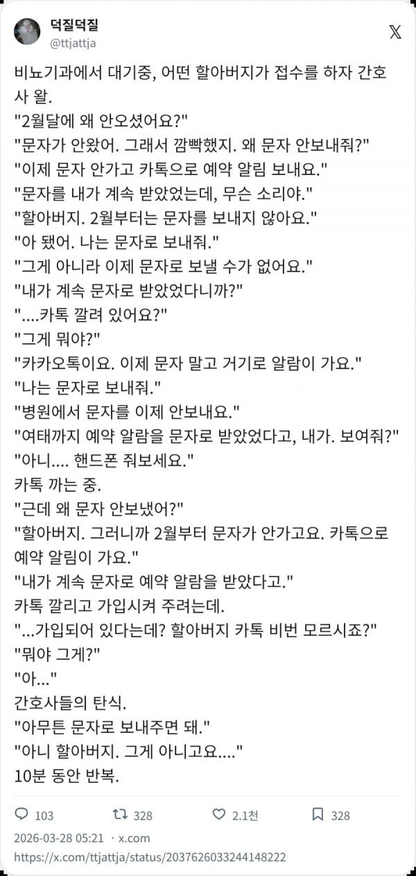 이제 문자로 안가고 카톡으로 가요 페이지 정보 작성자 pkg 댓글 0건 조회 119회 작성일 26-03-30 06:08 목록 답변 글쓰기 본문 이전글게임에 기술 이름이 없으면 생기는 일 26.03.30 다음글ADHD 검사받은 일본인 26.03.30 댓글 0 댓글목록 등록된 댓글이 없습니다.