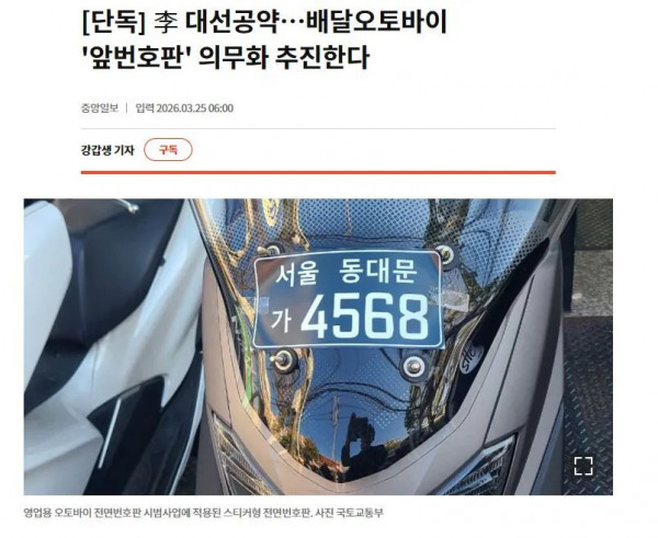 대선공약, 배달 오토바이 앞번호판 부착 의무화 추진 중 페이지 정보 작성자 pkg 댓글 0건 조회 183회 작성일 26-04-01 22:09 목록 답변 글쓰기 본문 https://www.joongang.co.kr/article/25414584 대선공약, 배달 오토바이 앞번호판 부착 의무화 추진 중 이전글고유가 충격에 ‘5월4일 임시공휴일’ 급부상 26.04.01 다음글가성비 최고라는 생체 경비 시스템 26.04.01 댓글 0 댓글목록 등록된 댓글이 없습니다.