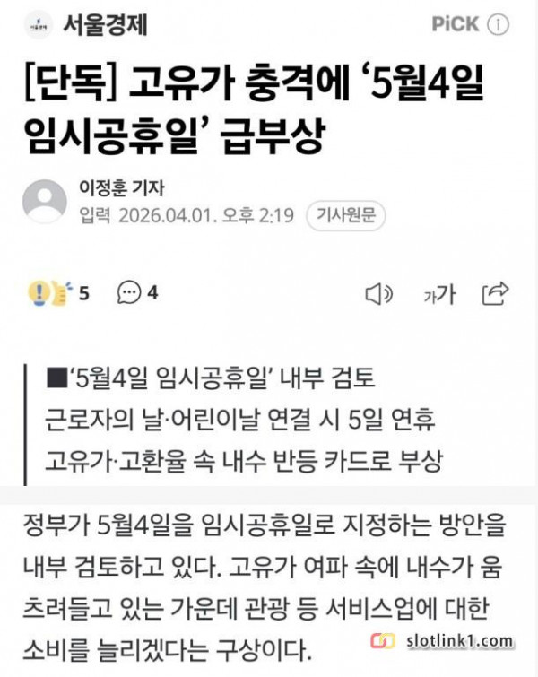 고유가 충격에 ‘5월4일 임시공휴일’ 급부상 페이지 정보 작성자 pkg 댓글 0건 조회 207회 작성일 26-04-01 22:10 목록 답변 글쓰기 본문 https://www.sedaily.com/article/20026997?ref=naver + https://n.news.naver.com/article/421/0008863803?sid=100 이전글임산부가 서운해하는데 내가 사과해야 할 일일까 26.04.01 다음글대선공약, 배달 오토바이 앞번호판 부착 의무화 추진 중 26.04.01 댓글 0 댓글목록 등록된 댓글이 없습니다.