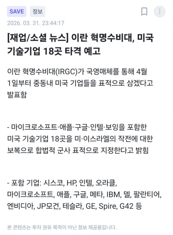 이란 혁명수비대, 미국 기술기업 18곳 타격 예고 페이지 정보 작성자 pkg 댓글 0건 조회 180회 작성일 26-04-02 01:46 목록 답변 글쓰기 본문 이전글최근 생겨났다는 신기한 트위터 문화 26.04.02 다음글러시아 "인간 개미집" 이라 불리는 건물 26.04.02 댓글 0 댓글목록 등록된 댓글이 없습니다.