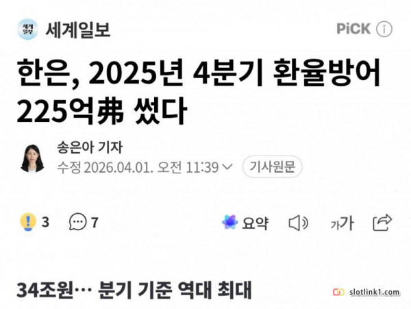 한은, 2025년 4분기 환율방어 225억弗 썼다 페이지 정보 작성자 pkg 댓글 0건 조회 128회 작성일 26-04-03 13:53 목록 답변 글쓰기 본문 이전글한국군이 전세계를 속인 것 ㄷㄷ 26.04.03 다음글해발 5486m에서 포착된 표범 ㄷㄷ 26.04.03 댓글 0 댓글목록 등록된 댓글이 없습니다.