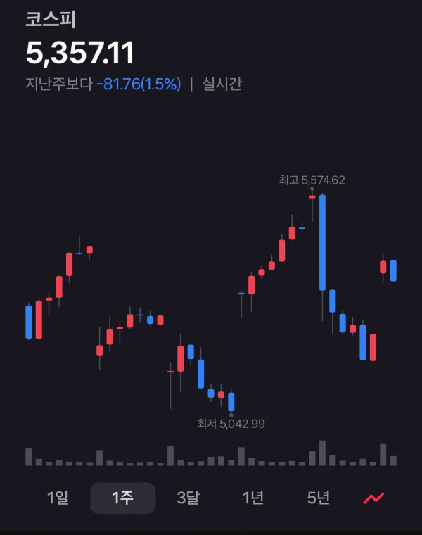 최근 일주일 코스피 그래프 꼬라지 페이지 정보 작성자 pkg 댓글 0건 조회 156회 작성일 26-04-03 21:01 목록 답변 글쓰기 본문 최저점 5042 최고점 5574 이전글진짜 쥰내 힙하다는 불교 굿즈 근황 26.04.03 다음글통일은 선택이 아니라 필수인 이유 26.04.03 댓글 0 댓글목록 등록된 댓글이 없습니다.