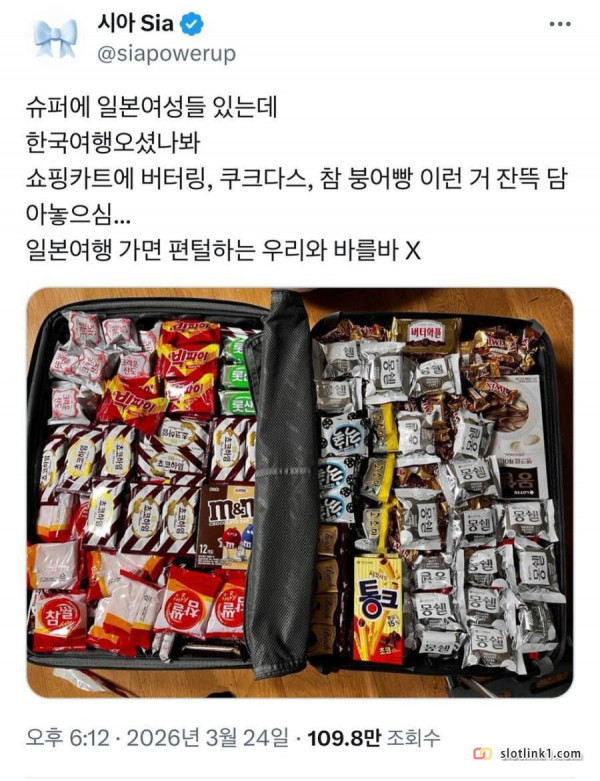 요즘 한국과자 싹쓸이하는 일본 여성 관광객들 페이지 정보 작성자 pkg 댓글 0건 조회 177회 작성일 26-04-03 23:22 목록 답변 글쓰기 본문 몽셸, 쵸코하임, 칙쵹 등등 우리가 일본가서 하는거랑 비슷한건지? 이전글일론 머스크에게 도움을 청하는 이란인 26.04.03 다음글5,000원이라는 부산 간짜장 맛집 26.04.03 댓글 0 댓글목록 등록된 댓글이 없습니다.
