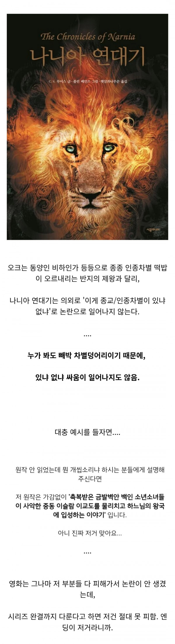 나니아 연대기가 인종차별 논란이 없는 이유 페이지 정보 작성자 pkg 댓글 0건 조회 115회 작성일 26-04-05 07:55 목록 답변 글쓰기 본문 누가봐도 백인우월주의 개독 꼴통 소설이라서 논란이 없음 이전글1400억원 짜리 남극 탐험 요트 26.04.05 다음글내 환자가 죽었는데 인생 별거없는것같다 26.04.05 댓글 0 댓글목록 등록된 댓글이 없습니다.