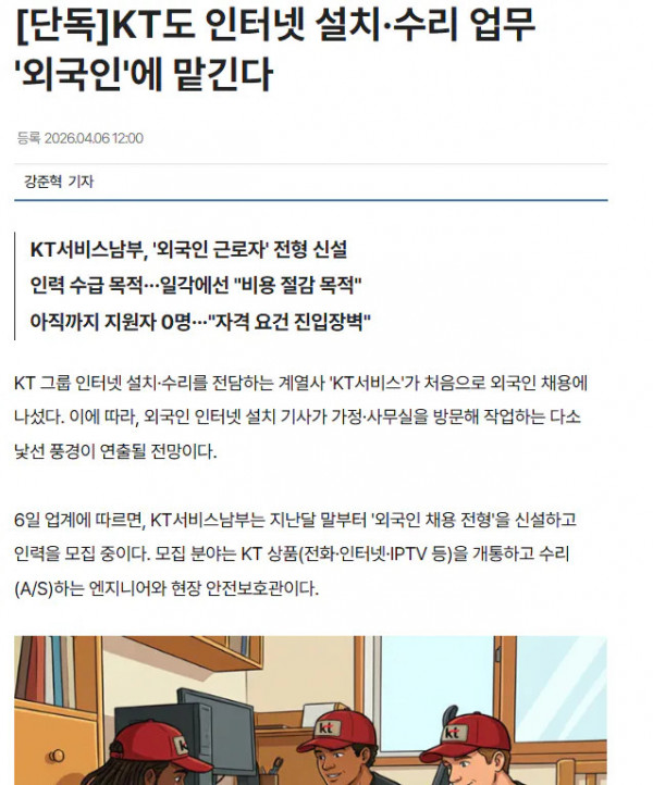KT도 인터넷 설치·수리 업무 '외국인'에 맡긴다 페이지 정보 작성자 pkg 댓글 0건 조회 208회 작성일 26-04-06 18:24 목록 답변 글쓰기 본문 https://www.newsway.co.kr/news/view?ud=2026040610185182523 외국인이 집에 들어올 날이 머지 않았구나 이전글전기 죽어있대서 잘랐다가 죽을 뻔 했음 26.04.06 다음글회사앞 편순이 취직시킨 사장 26.04.06 댓글 0 댓글목록 등록된 댓글이 없습니다.