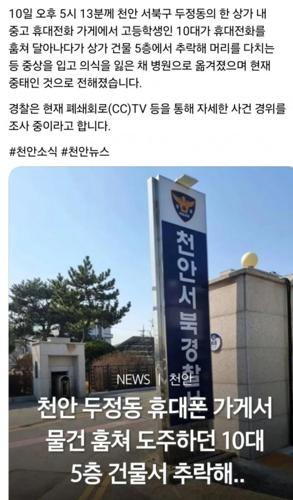 10대 청소년, 5층 건물에서 추락해 중태 페이지 정보 작성자 pkg 댓글 0건 조회 186회 작성일 26-04-12 10:24 목록 답변 글쓰기 본문 10대 청소년, 5층 건물에서 추락해 중태 이전글풍속화만 잘 그린 게 아니었던 김홍도 26.04.12 다음글한국인의 상충되는 두가지 욕구 26.04.12 댓글 0 댓글목록 등록된 댓글이 없습니다.