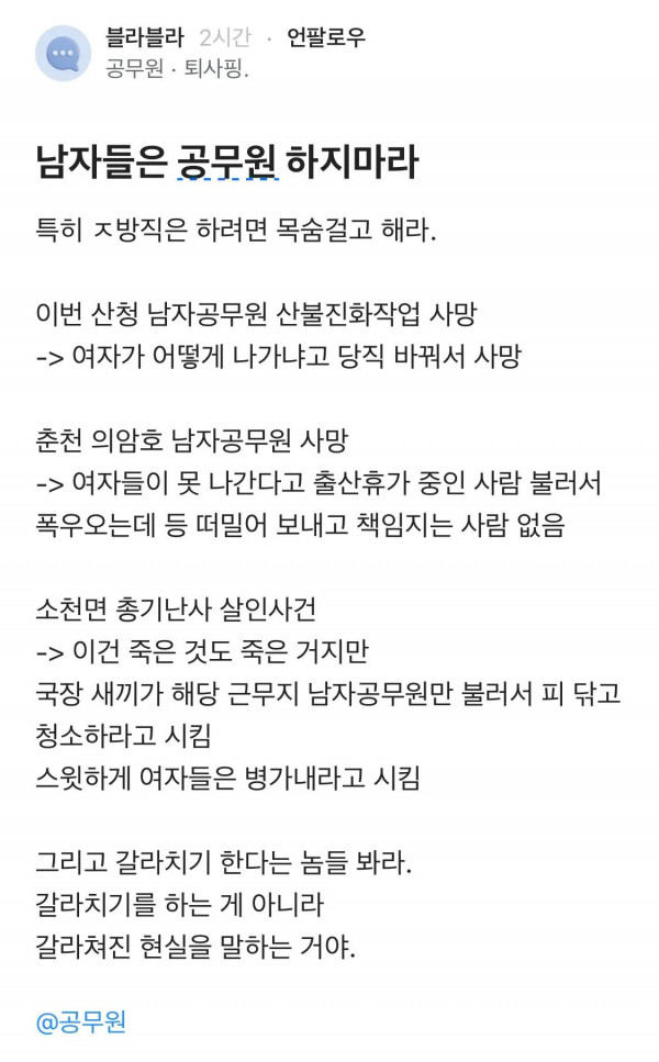 남자들은 공무원 하지마라는 공무원 페이지 정보 작성자 pkg 댓글 0건 조회 189회 작성일 26-04-12 23:55 목록 답변 글쓰기 본문 갈라쳐진 현실 쌉 공감... 남자들은 공무원 하지마라는 공무원 이전글우울증 1년만에 완치한 사람의 경험 공유 26.04.12 다음글"급식 메뉴 가능한 것만 적어주세요!" 26.04.12 댓글 0 댓글목록 등록된 댓글이 없습니다.