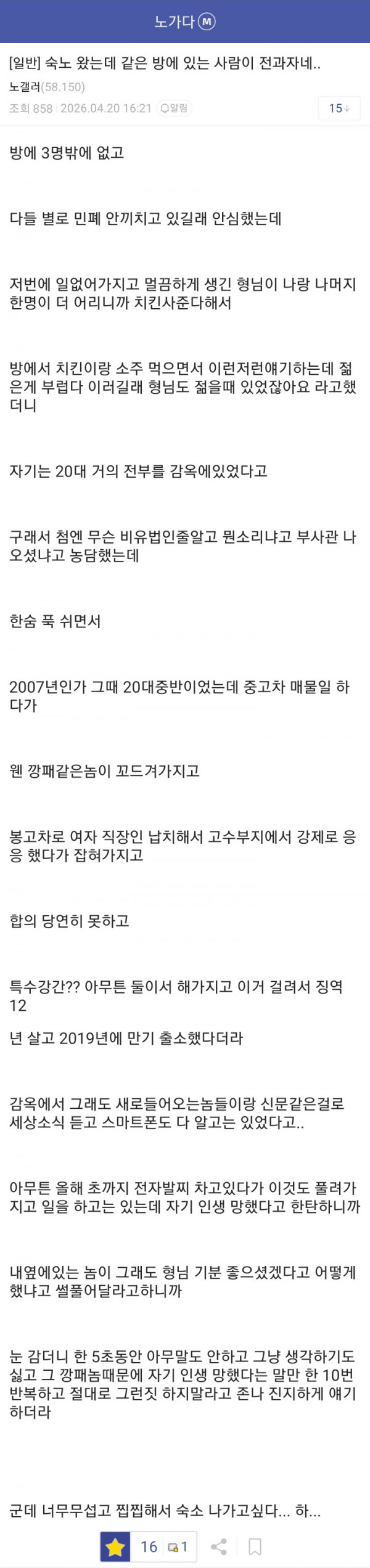 숙식 노가다하는데 같은 방 사람 전과자네... 페이지 정보 작성자 pkg 댓글 0건 조회 180회 작성일 26-04-22 21:07 목록 답변 글쓰기 본문 ㄷㄷㄷ 숙식 노가다하는데 같은 방 사람 전과자네... 이전글20살 성인되고 처음 소주 마셔본 사람의 후기 26.04.22 다음글수강생 10명 중 9명이 합격한 비결 ㄷㄷㄷ 26.04.22 댓글 0 댓글목록 등록된 댓글이 없습니다.