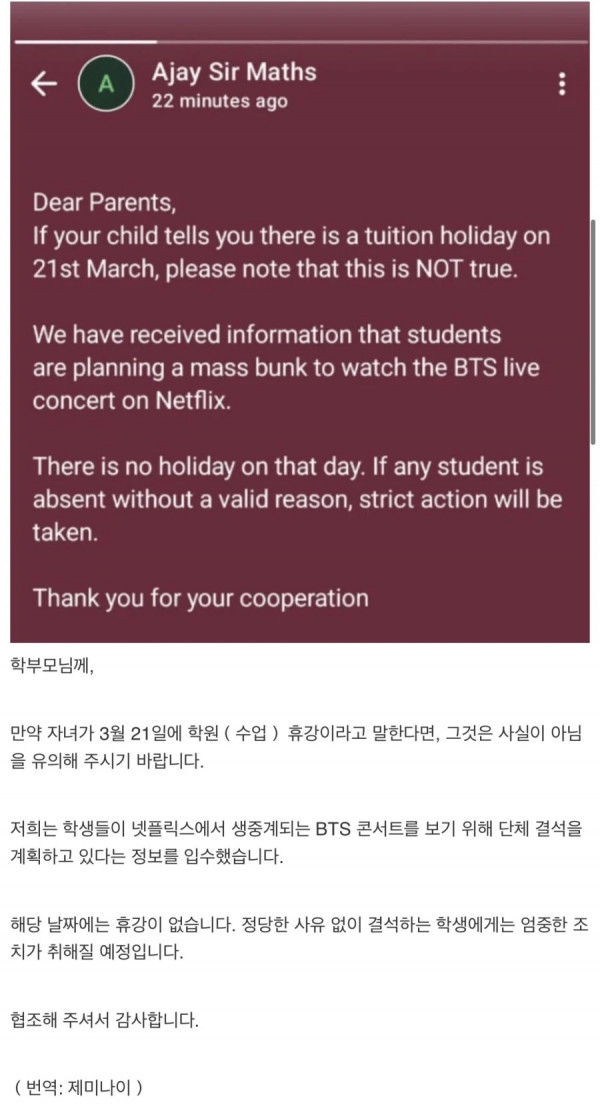 인도의 한 수학학원의 학부모 공지문 페이지 정보 작성자 fiveou 댓글 0건 조회 407회 작성일 26-03-16 15:12 목록 답변 글쓰기 본문 보건결석도 안되고, 친척상도 안되고, 이 안에 배신자가 있다. 이게 내 결론이다. 이전글 이상하게 합격 했다는 사람이 없는 곳 26.03.16 다음글 사람마다 진짜 갈리는 인생 밥상.jpg 26.03.16 댓글 0 댓글목록 등록된 댓글이 없습니다.