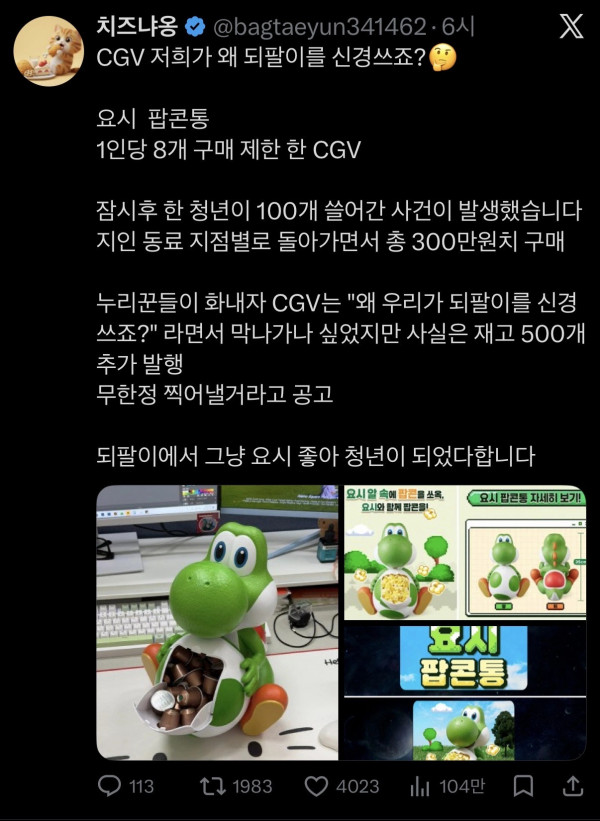 CGV : 저희가 되팔이를 왜 신경쓰나요? 페이지 정보 작성자 fiveou 댓글 0건 조회 128회 작성일 26-04-24 23:16 목록 답변 글쓰기 본문 요시 좋아하시면 그냥 많이 사가시면 됩니다. 이전글나나한테 7cm 깊이로 찔렸다는 강도 26.04.25 다음글왕따 당하던 남학생의 역전승 26.04.24 댓글 0 댓글목록 등록된 댓글이 없습니다.