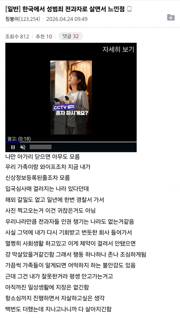 한국에서 성범죄 전과자로 살면서 느낀점 페이지 정보 작성자 pkg 댓글 0건 조회 200회 작성일 26-04-25 05:03 목록 답변 글쓰기 본문 이전글일본인들이 어깨빵하는 이유 26.04.25 다음글성수기 기준 천만원씩 번다는 여성 에어컨 수리 기사 26.04.25 댓글 0 댓글목록 등록된 댓글이 없습니다.