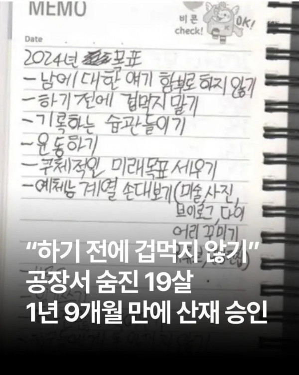 마음이 먹먹해지는 19살 청년의 메모 페이지 정보 작성자 pkg 댓글 0건 조회 200회 작성일 26-04-26 03:32 목록 답변 글쓰기 본문 “하기전에 겁먹지 않기“전남의 한 직업계 고등학교에 다니던 박씨는 2023년 11월 공장으로 현장실습을 나온 뒤 다음 달부터 생산팀에 입사해 일해왔다. 2024년 6월16일 아침 8시께 박씨는 홀로 배관 점검 업무에 나섰다가 심정지 상태로 바닥에 쓰러진 채 발견돼 병원으로 옮겨졌지만 숨졌다.아. 마음이 먹먹해지는 19살 청년의 메모 이전글한국의 특이한 지역별 의류 수거함 별명들 26.04.26 다음글베트남 외노자한테 뒷통수 맞고 사기당한 사장님 26.04.26 댓글 0 댓글목록 등록된 댓글이 없습니다.