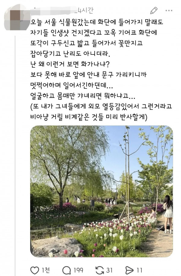 서울식물원 화단 논란 페이지 정보 작성자 pkg 댓글 0건 조회 175회 작성일 26-04-28 03:17 목록 답변 글쓰기 본문 서울 식물원측에서 화단에 들어가지말라고 경고문을 붙여놓았음에도 들어가서 꽃밟고 사진찍는 사람들이 많아서 논란. 인스타에 서울식물원 검색하면 경고문 무시하고 들어가서 찍은 사진들 굉장히 많다고함. 이전글요시 팝콘통 되팔렘들 근황 26.04.28 다음글혐주의) 삼첩분식 사과문 26.04.28 댓글 0 댓글목록 등록된 댓글이 없습니다.