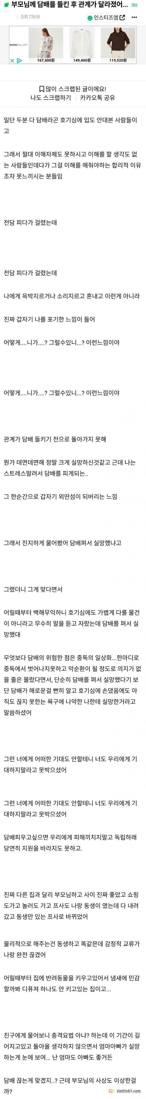 부모님께 담배를 들킨후 관계가 달라졌어 페이지 정보 작성자 pkg 댓글 0건 조회 201회 작성일 26-04-29 14:18 목록 답변 글쓰기 본문 이전글법으로 금지해야 하는 음식 26.04.29 다음글한때 한국에서 난리났던 푸바오 근황 26.04.29 댓글 0 댓글목록 등록된 댓글이 없습니다.