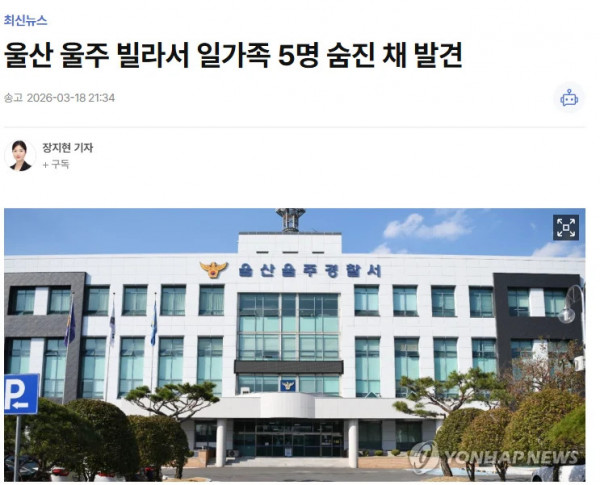 울산 울주 빌라서 일가족 5명 숨진 채 발견 | 연합뉴스