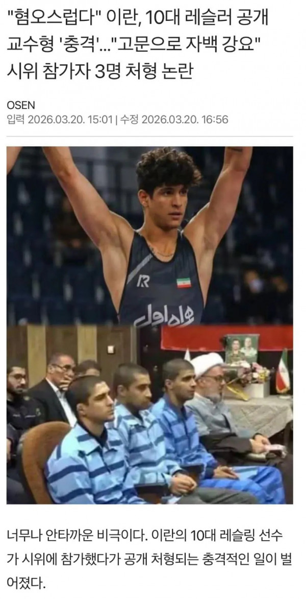 "혐오스럽다" 이란 10대 레슬러 공개 교수형 페이지 정보 작성자 pkg 댓글 0건 조회 183회 작성일 26-03-21 15:30 목록 답변 글쓰기 본문 https://www.chosun.com/sports/sports_general/2026/03/20/G44GEYRTGRRTSZTDHA2TSNBQGY/?outputType=amp 전쟁 일으킨게 트럼프의 바보짓인것과 별개로 이란도 진짜 답없는 국가 이전글최근 체감상 진짜 개부자 집에 있는 가전제품 근황 26.03.21 다음글자식 넷을 죽이고 자살한 30대 가장의 비하인드 26.03.21 댓글 0 댓글목록 등록된 댓글이 없습니다.