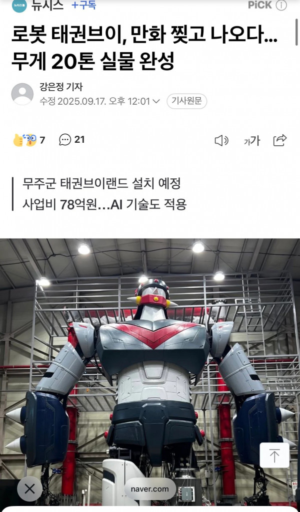 태권브이 20톤 실물제작 근황 페이지 정보 작성자 pkg 댓글 0건 조회 142회 작성일 26-03-21 16:45 목록 답변 글쓰기 본문 https://n.news.naver.com/mnews/article/003/0013486723?sid=101&lfrom=twitter&spi_ref=m_news_x 제발...왜 이딴 짓을.. 이전글2004년 서울 종로2가 풍경 26.03.21 다음글최근 체감상 진짜 개부자 집에 있는 가전제품 근황 26.03.21 댓글 0 댓글목록 등록된 댓글이 없습니다.