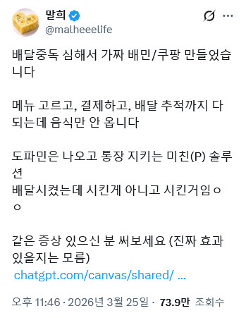 배달앱 중독자가 만든 가짜 배달앱 페이지 정보 작성자 pkg 댓글 0건 조회 362회 작성일 26-03-28 13:32 목록 답변 글쓰기 본문 이전글농심에서 이번에 공개한 신라면 캐릭터 근황 26.03.28 다음글몽골에 수출된 삼겹살 문화 26.03.28 댓글 0 댓글목록 등록된 댓글이 없습니다.