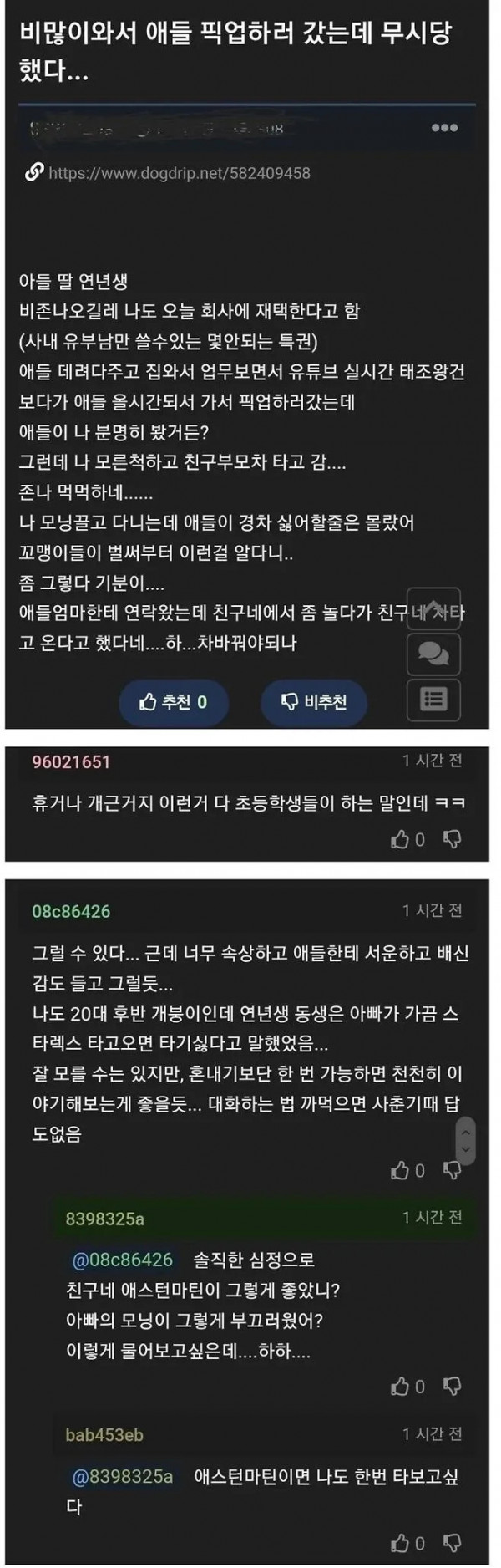 울먹울먹 자식에게 외면당한 아버지 페이지 정보 작성자 pkg 댓글 0건 조회 193회 작성일 26-03-29 22:41 목록 답변 글쓰기 본문 애스턴마틴이면 나도 태워달라고 해야지 머하고 있어!! 이전글회사에 의해 망가지는 사람의 과정 26.03.29 다음글실수령 730만원 3인 가족 생활비 26.03.29 댓글 0 댓글목록 등록된 댓글이 없습니다.