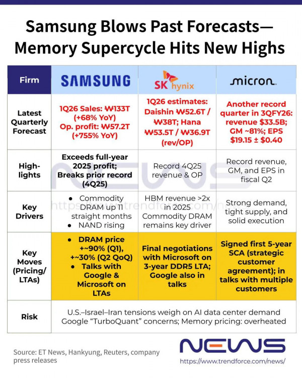 제조업의 왕이 된 메모리 반도체 산업 페이지 정보 작성자 pkg 댓글 0건 조회 153회 작성일 26-04-10 20:51 목록 답변 글쓰기 본문 1분기 삼성전자 DS 메모리 사업부 잠정실적 매출 약 76조 영업이익 약 55.2조 이익률 72.6% 1분기 SK 하이닉스 예상실적 매출 약 52.6조 영업이익 약 38조 이익률 72.2% 2분기(3~5월) 마이크론 예상실적 매출 약 50.3조 영업이익 약 37.2조 이익률 74% 영업이익률 70% 돌파 ㄷㄷㄷ 이전글신라에 대해 밝혀진 어제자 충격적인 사실 26.04.10 다음글"일진 동창이 동창회에서 진상을 부렸습니다." 26.04.10 댓글 0 댓글목록 등록된 댓글이 없습니다.