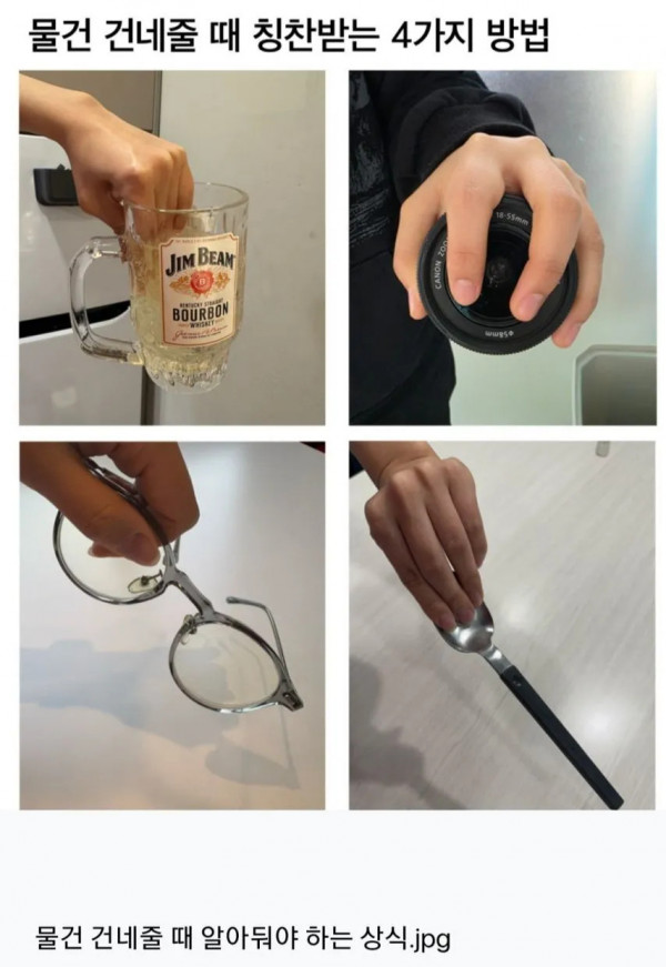 물건 건네줄 때 칭찬받는 4가지 방법 페이지 정보 작성자 pkg 댓글 0건 조회 214회 작성일 26-04-12 00:05 목록 답변 글쓰기 본문 이전글베트남 처녀와 결혼한 회사 아재 26.04.12 다음글깔끔한 코딩의 예 26.04.11 댓글 0 댓글목록 등록된 댓글이 없습니다.