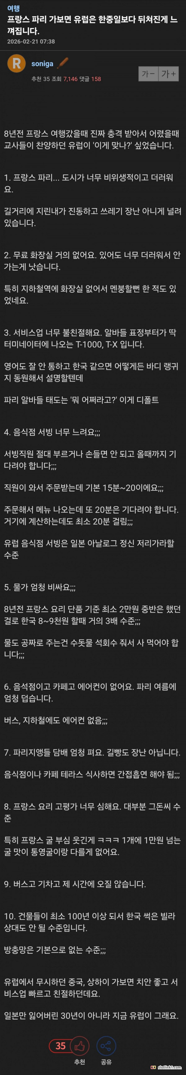 유럽 여행 가면 실망하는 이유 페이지 정보 작성자 pkg 댓글 0건 조회 152회 작성일 26-02-22 00:23 목록 답변 글쓰기 본문 비싼물가 소매치기 느린행정 인종차별 막상 여행가면 동북아 여행만도 못해서 이전글총각파티 끝나고 결혼이 취소되었다는 사연 26.02.22 다음글일본인이 만든 한중일 문제해결 과정 26.02.21 댓글 0 댓글목록 등록된 댓글이 없습니다.