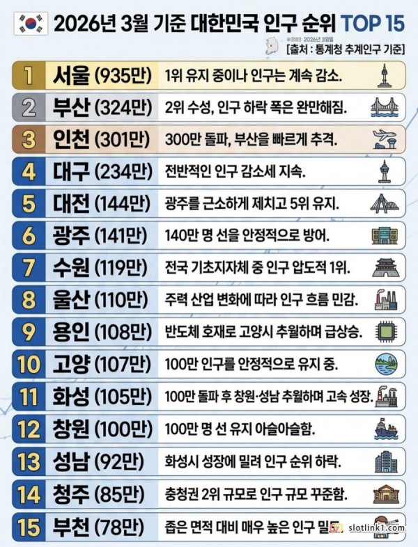 최신자 대한민국 도시 인구 순위 페이지 정보 작성자 pkg 댓글 0건 조회 341회 작성일 26-04-16 01:39 목록 답변 글쓰기 본문 26년 3월 기준 이전글"하이닉스 성과급에 억울하다는 시민" 26.04.16 다음글조니 소말리 판결에 환호하는 일본 반응 26.04.16 댓글 0 댓글목록 등록된 댓글이 없습니다.